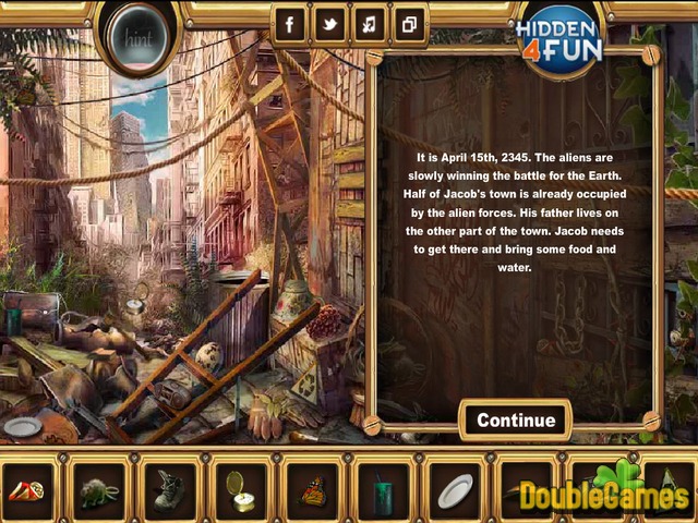 เล่นเกมวัตถุที่ซ่อนอยู่ใหม่ที่น่าตื่นเต้นออนไลน์ข้ามสิ่งกีดขวาง! คุณไปที่ไหนสักแห่งในอนาคตสมมติหรือบางทีมันอาจจะเป็นในอนาคตจริง ... แต่นั่นเป็นสิ่งที่เราไม่สามารถรู้ได้ ในอนาคตนี้สิ่งมีชีวิตจากดาวดวงอื่นเริ่มครอบครองดินแดนบางอย่างจากโลก การบุกรุกนี้ดูเหมือนว่าจะค่อนข้างแข็งแกร่งและไม่ช้าก็เร็วมันจะครอบครองโลกทั้งโลก หนึ่งในดินแดนยึดครองเป็นเมืองของจาค็อบและเป็นส่วนหนึ่งของเมืองอยู่ภายใต้การล้อมโดยมนุษย์ต่างดาว จาค็อบได้ที่จะได้รับไปยังส่วนอื่น ๆ ของเมืองที่พ่อของเขามีชีวิตอยู่และนำเขาอาหารและน้ำเพื่อให้เขาสามารถอยู่รอดล้อม