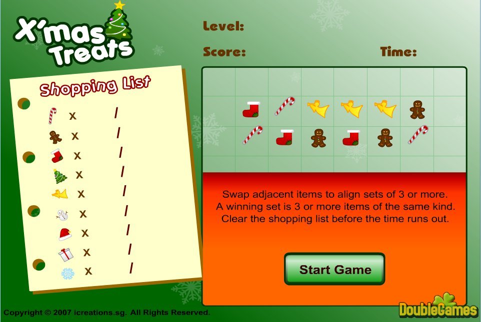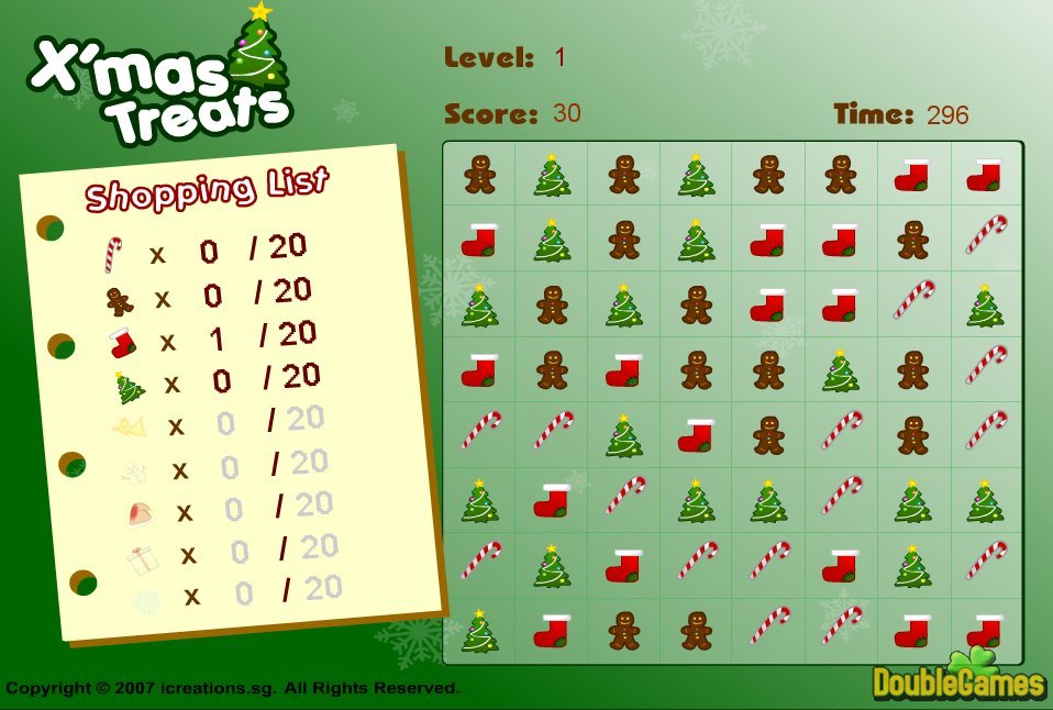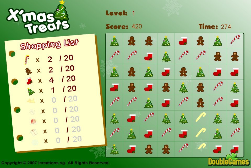 อะไรที่คุณคริสมาสต์รายการหลัก know? ต้นคริสต์มาส, candies, คุกกี้และอื่น ๆ แต่หนึ่งในวันหยุดที่ยิ่งใหญ่ที่สุดเป็นเพียงรอบมุมเพื่อให้คุณมีเวลาน้อยมากที่จะทำให้การเตรียมการทั้งหมดสำหรับการเฉลิมฉลอง ใน Treats X'mas คุณจะถูกส่งไปที่ร้านซื้อสิ่งที่จำเป็นมากสำหรับคริสมาสต์ เล่นเกมนี้การจับคู่สามตลกและล้างรายการช้อปปิ้งของคุณก่อนที่นาทีที่เหล่านี้หมด ระวัง! มีบทลงโทษครั้งคือเมื่อคุณคลิกที่ปุ่มคำใบ้ ลอง X'mas เกมออนไลน์ฟรีอย่างถือว่าได้ฟรีเพื่อกำหนดอารมณ์วันหยุดของคุณ